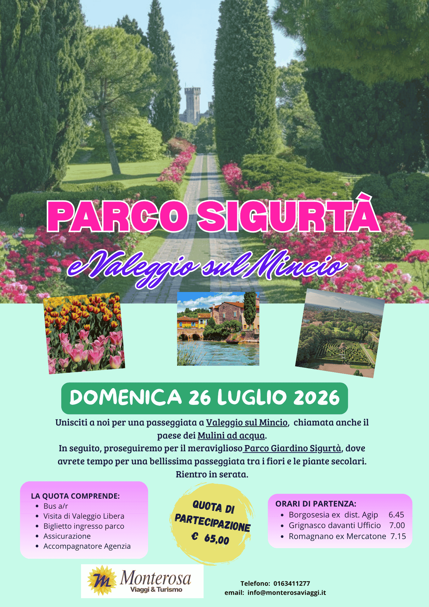 In seguito, proseguiremo per il meraviglioso Parco Giardino Sigurtà, dove avrete tempo per una bellissima passeggiata tra i fiori e le piante secolari.